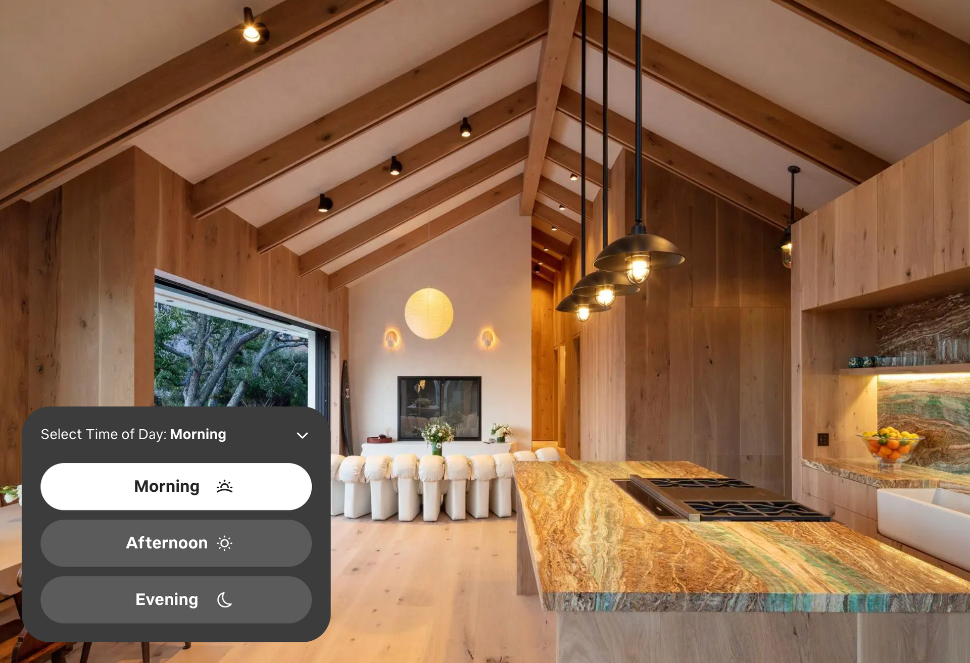 Lutron lighting and window treatments know what time it is and what your preferences are, mixing color and adjusting shade position to create the right light for each moment